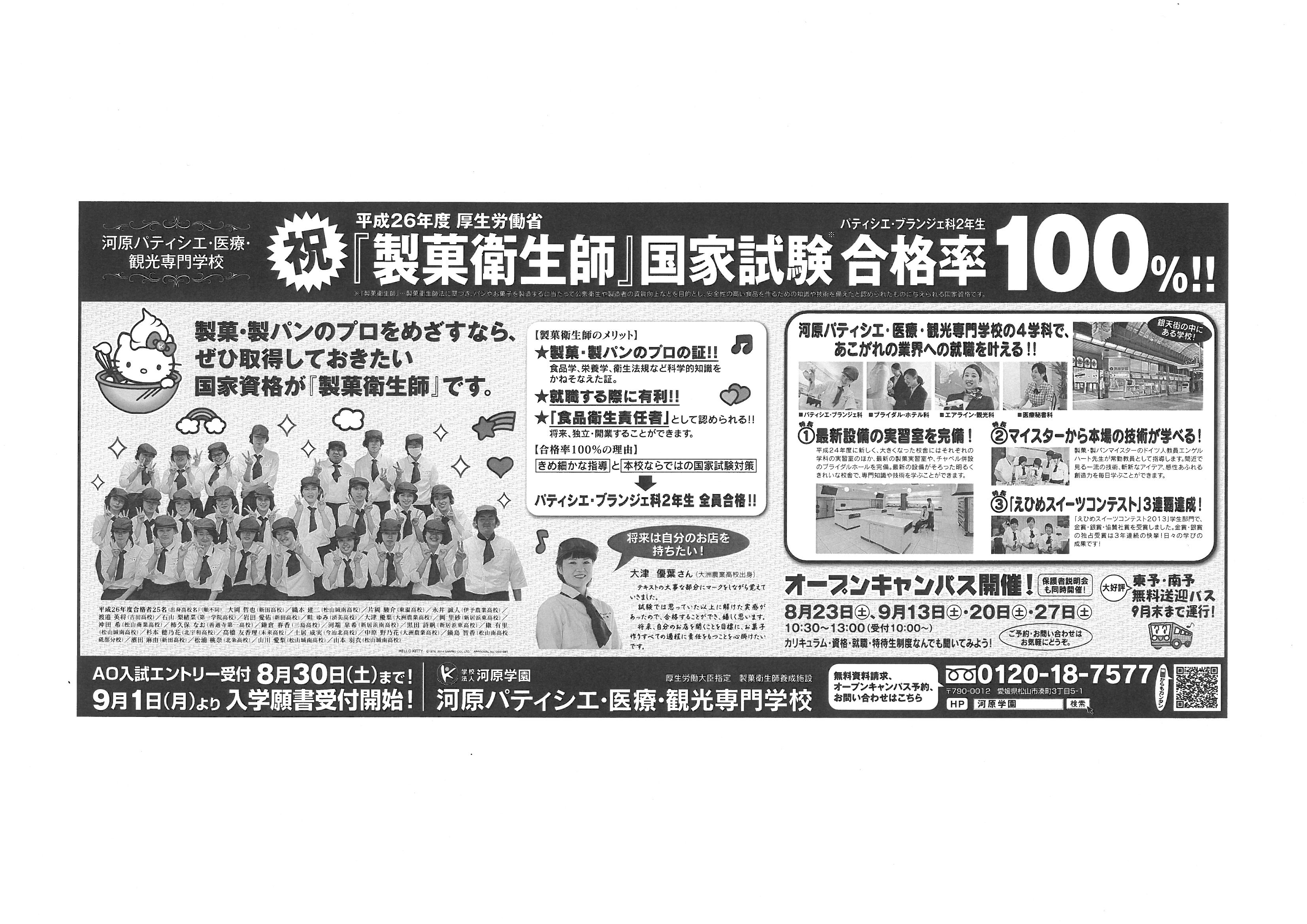 テレビ欄下に、「製菓衛生師 国家試験合格率100%!!」と、大きな広告が掲載されました