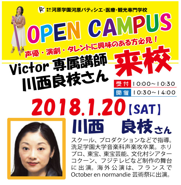 2018年1月13日 新着情報 1月20日(土)声優タレント科オープンキャンパス 東京から講師来校! 1月20日(土)の声優タレント科のオープンキャンパスでは 東京からVictor専属のボーカル講師 川西先生が来校し、 実際にレッスンを受けることができます スクールやプロダクションなどで指導しているプロの方から 直接指導してもらえるチャンス 声優、演劇、歌手などに興味のある方はぜひお友達を誘って オープンキャンパスにご参加くださいね ご予約は→こちら←から 一覧に戻る