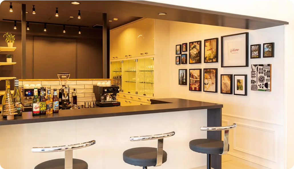 カクテル作りにも取り組める「バーカウンター」。また、多くのカフェで使用されている『LA MARZZOCCO』のエスプレッソマシンを導入し、「カフェカウンター」としても利用できるようになりました!アドバンス・コーヒーマイスターの資格を持つ教員やカフェのオーナーからマシンの使用方法やおいしいドリンクの作り方を本格的に学べます。