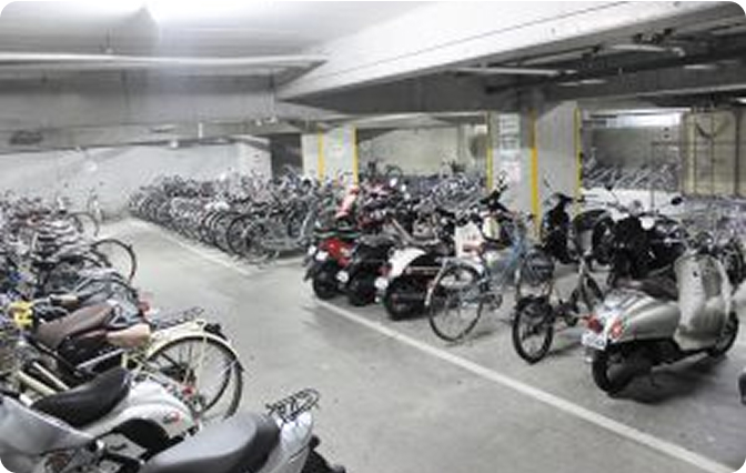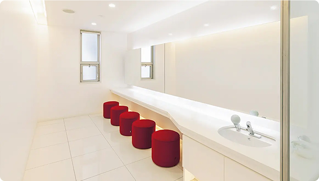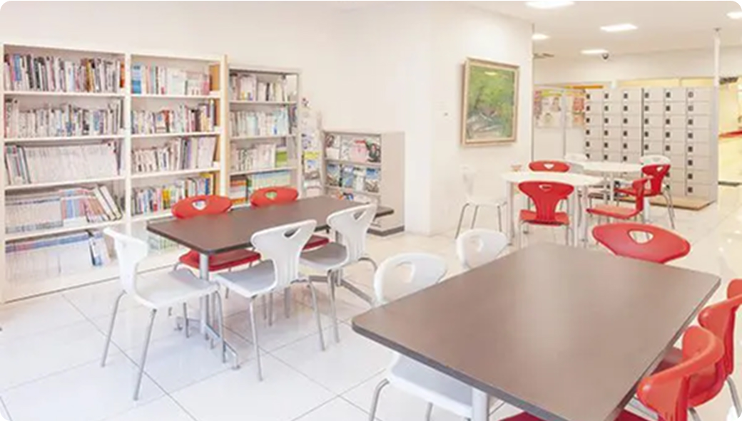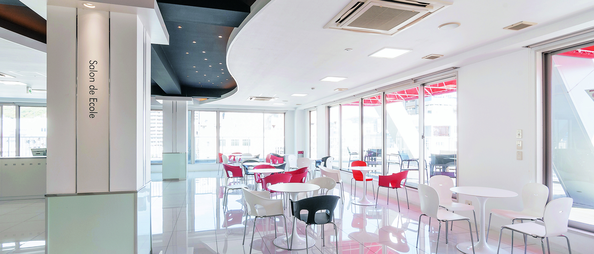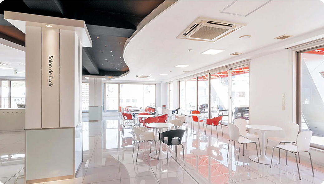 「学生ホール」の天井は、天の川をイメージし洗練されたお洒落な空間。学生が気軽に利用できるコミュニティースペース。外のカフェテラスも人気の場所です。パウダールームなども複数設置しており、お化粧直しなどに利用できます。