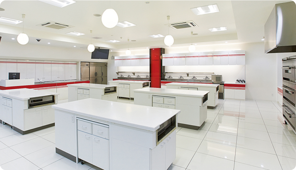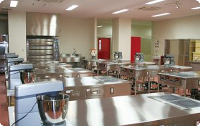 最新カメラ&モニター完備の実習室です。洋菓子、製パン、和菓子、カフェ実習まですべての実習に対応できる器具、設備を備えたオールマイティーな実習室です。随時解放されており、授業以外でも作品を製作したり、自主練習などで利用することができます。