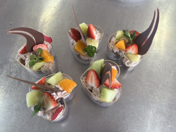 上にチョコホイップクリーム、フルーツ、ミント、飾りチョコで飾り付けしています✨