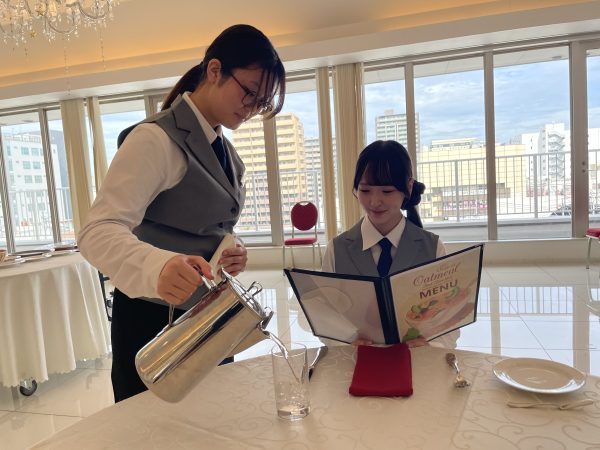 ブライダル・ホテル科では、「レストランサービス技能検定」というレストランやホテルなどの職場で、料理や飲み物を給仕するウェイターおよびウェイトレス、そしてマネージャーの接客能力を見るために実施されている検定試験の資格取得を目指しております。この検定は職業能力開発促進法に基づいて厚生労働省が認定しており、学科・実技の試験を合格した者には「レストランサービス技能士」の【国家資格】が与えられます!また、協会から購入した各級のバッジをつけて仕事をすることで知識や技術があることの証明にもなります。