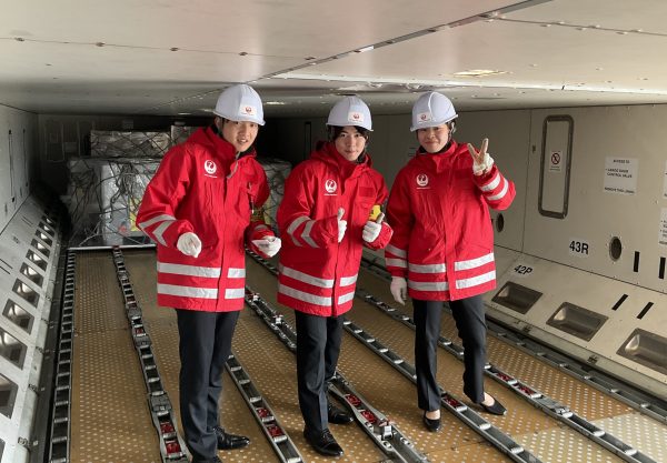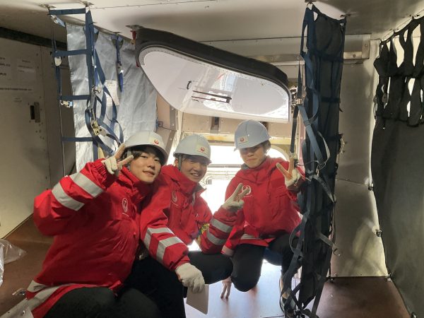 3名とも真っ赤なJALのレインコートを着させていただきました☺