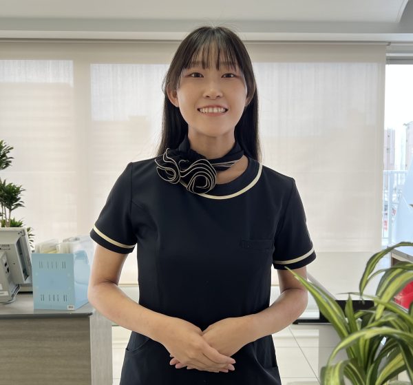 「高校生の時にヘアドネーションを経験し、裏方として誰かの役に立つことに興味を持ちました。そこから直接治療などはしないけれど患者さんに寄り添うことの出来る医療事務員になりたいと思いました。病院に来て患者さんが一番最初に会うのは医療事務員なので病院の顔として笑顔を忘れず、安心してもらえる対応の出来る医療事務員を目指したいです」