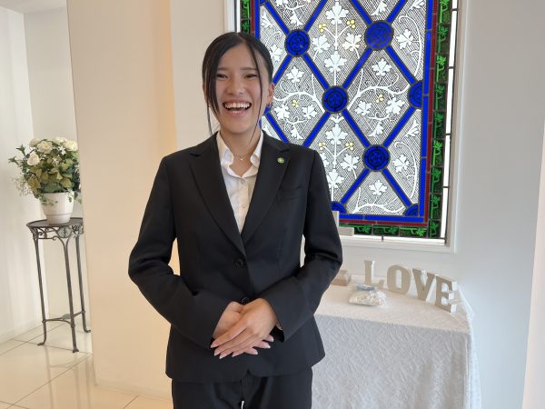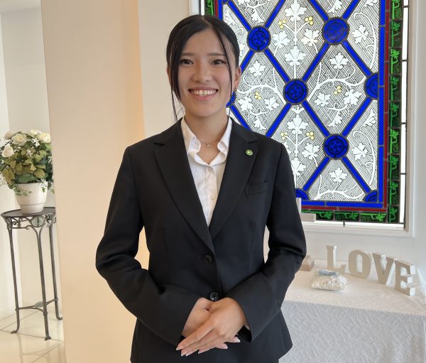 「私がこの学校に入学を決めたきっかけは、母の友人の結婚式が始まりです。中学生の頃、母の友人の結婚式に参列させていただいた際に、困っているお客様がいるとすぐに駆けつけて助けている、結婚式が最初から最後まで失敗しないように見守るプランナーさんを見ていて私も視野が広く、人のために完璧に尽くせる人になりたいと思ったのがきっかけです。」