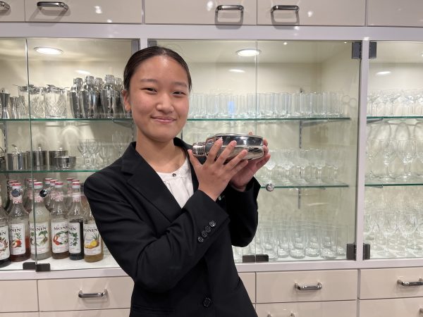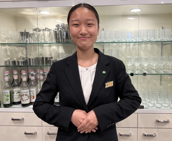 「ホテルに宿泊した際、働いていたホテルスタッフの笑顔溢れる姿に感銘を受け、ホテルスタッフを目指すようになりました。オープンキャンパスの時、座学だけでなく、インターンシップや県外での研修を通して、実際に使われているサービスを学べると聞きました。生きたサービスを自分の目で見て体験出来ることに魅力を感じこの学校に入学を決めました」