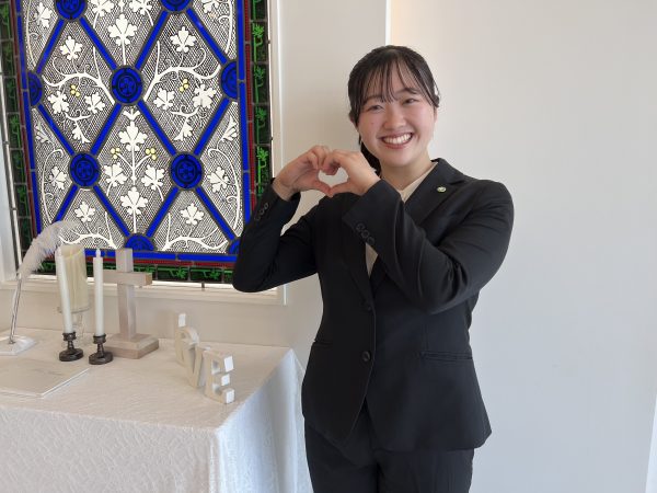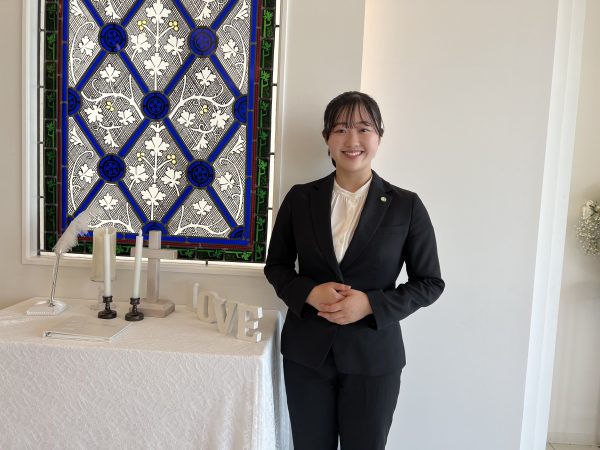 「小学生の頃、初めて親戚の結婚式に参加したくさんの人が笑顔になっているのを見て、将来こういう場面に携わる仕事をしたいと思いブライダルに興味を持ちました。高校生の頃オープンキャンパスに参加し、先生方や先輩たちからのお話を聞いて、すごくいいところだなと思ったので入学を希望しました。」