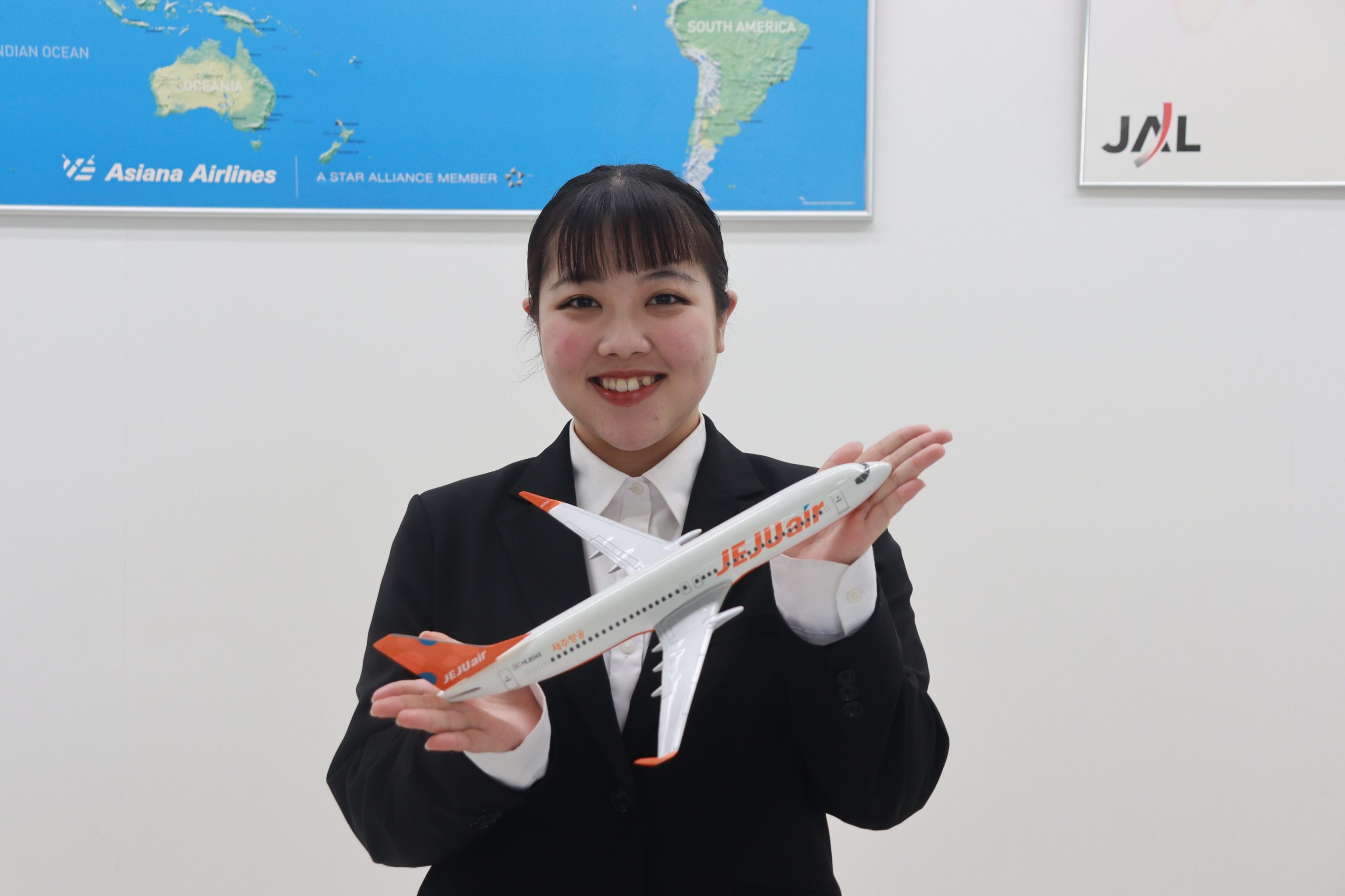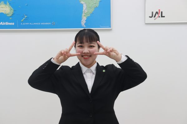 「留学に行った際は、松山空港からですのでたくさんの空港を利用しフィリピンまで行きました。フィリピンから松山空港に帰ってきた際に、グランドスタッフの方のアナウンスを聞いた時とても安心して涙が出そうになったのを覚えています。そういったことから、私も空港に来られる方に安心していただけるようなグランドスタッフになりたいと思いました。また、エアライン観光科の友人とも英語の授業で一緒になることが多く、その際にいろんな話を聞くことで自分もグランドスタッフになりたいと思いました。」