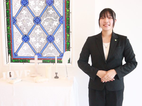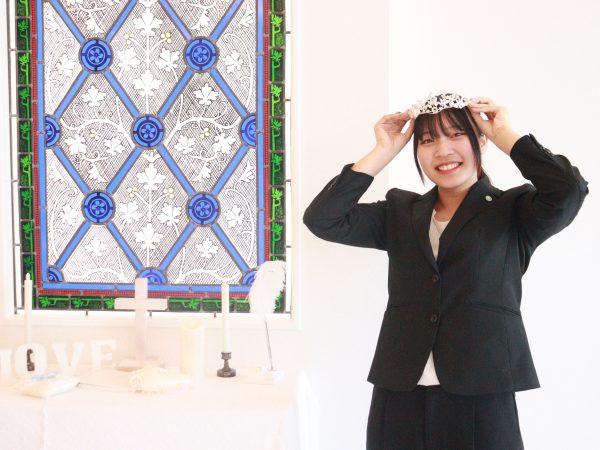 「私が入学した理由は、インターンシップやリアルウェディング、模擬挙式などの実習が充実しているからです。専門的な分野を勉強しながら、実際に体験することができるということに感動して、入学を決めました。」