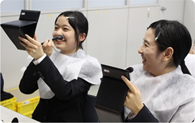 身だしなみは第一印象を決める大きな要素となります。外部講師をお招きし、スーツの着こなしセミナーやメイクアップセミナーを実施しています。就職活動だけでなく就職後も必要とされる社会人としての身だしなみを身に付けます。